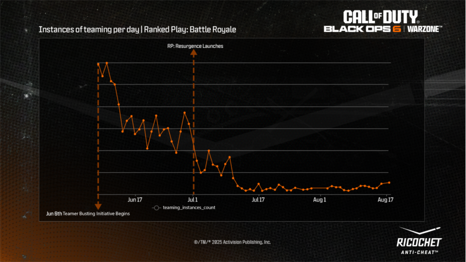 Em Black Ops 6, foram constatados progressos significativos: As últimas atualizações permitiram encerrar o trabalho de desenvolvedores de cheats mais rapidamente, além de possibilitar que a equipe atuasse de maneira mais ágil contra trapaceiros, mantendo as tabelas de classificação do Jogo Ranqueado mais limpas.