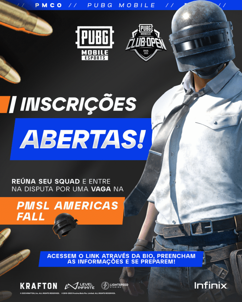As inscrições do PMCO Fall 2025 ficam abertas até 6 de agosto e o regulamento completo pode ser conferido aqui. As partidas da competição serão transmitidas com participações de Ferzote e Diego Hads ao vivo nos canais oficiais do PUBG MOBILE no Facebook, Instagram, X, TikTok e YouTube às 19h.