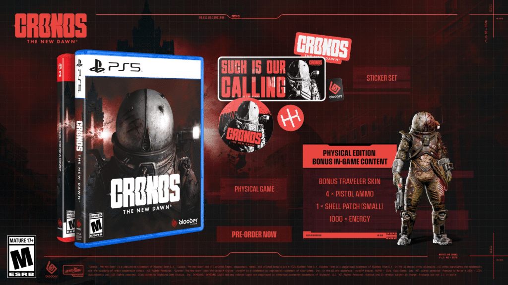 O jogo será lançado oficialmente, no formato digital, em todas as plataformas (incluindo Nintendo Switch 2) em 5 de setembro, às 11h (horário de Brasília). A Edição Deluxe digital (R$ 290), já disponível para pré-venda (Steam, Epic Games Store, PlayStation 5 e Xbox Series X|S), oferece acesso antecipado de 48 horas. Isso significa que, se reservar a Edição Deluxe hoje (3), poderá começar a jogar Cronos imediatamente. Ela inclui tudo da Edição Digital Padrão, além de:
