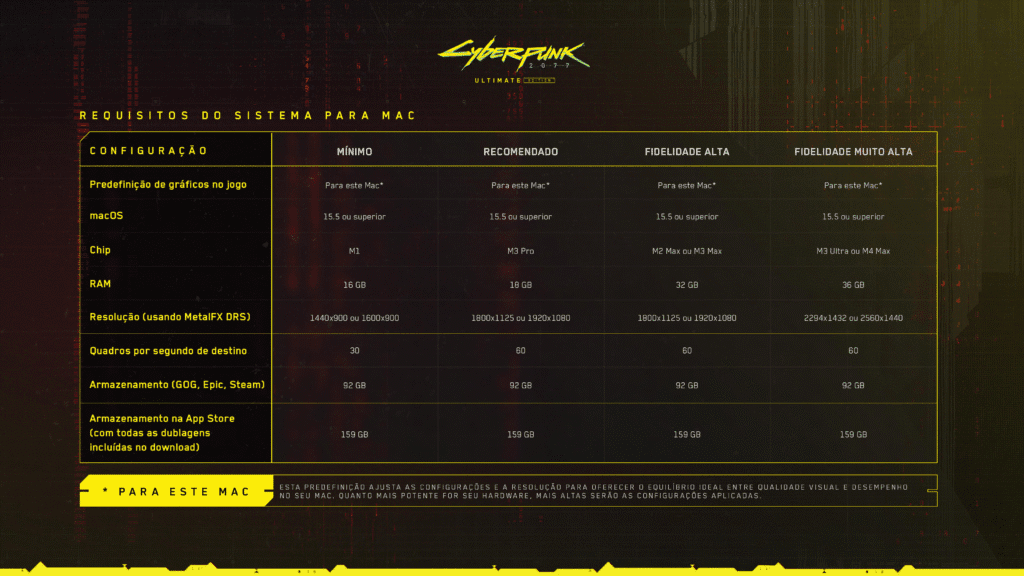 Cyberpunk 2077: Ultimate Edition foi otimizado para modelos Mac com Apple Silicon e 16GB ou mais de memória unificada, rodando no macOS 15.5 ou superior. Aproveitando ao máximo o potencial do Apple silicon e da tecnologia Apple Metal, o título permite que os jogadores vivenciem o futuro sombrio de Night City com jogabilidade fluida e visuais impressionantes no Mac.
