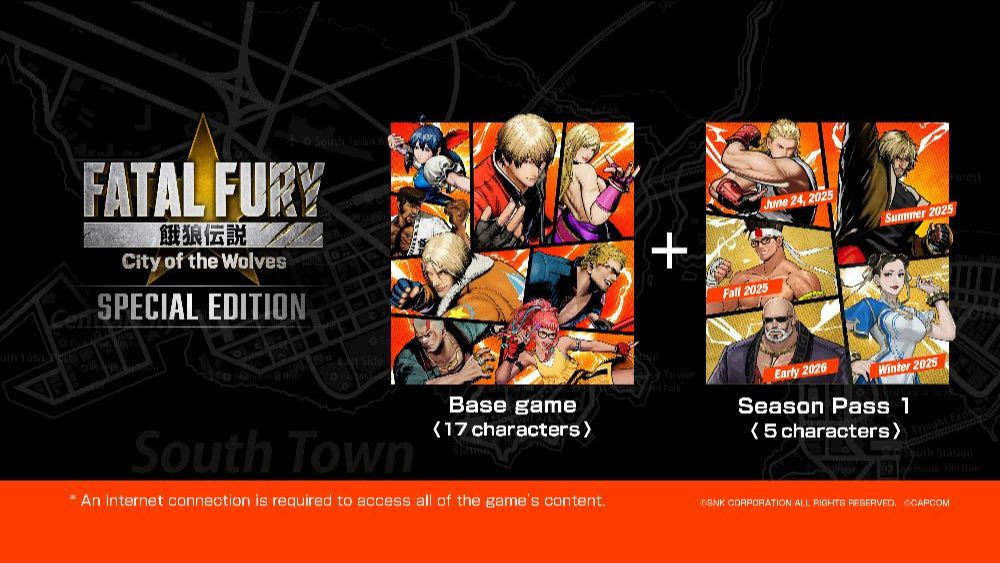 FATAL FURY: City of the Wolves está disponível na versão Special Edition, que já acompanha o Season Pass 1 – o pacote conta com cinco novos personagens que chegam ao game até o começo de 2026, incluindo Ken Masters e Chun-li, lutadores convidados da série Street Fighter. O próprio Ken e Andy Bogard já estão disponíveis e, recentemente, a SNK divulgou o trailer de Joe Higashi, o próximo personagem da temporada. FATAL FURY: City of the Wolves só está disponível no formato Special Edition e não há planos de vender o jogo base e o Season Pass 1 separadamente.