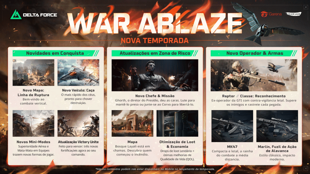 A nova temporada War Ablaze acaba de chegar ao Garena Delta Force, apresentando atualizações significativas na jogabilidade e nos mapas dos modos Conquista e Zona de Risco. Além disso, os fãs e jogadores podem conferir novas colaborações com duas grandes franquias — um evento com a franquia de filmes de terror da Lionsgate, Jogos Mortais, disponível até 21 de novembro, e uma campanha com METAL GEAR SOLID Δ: SNAKE EATER, da Konami Digital Entertainment (KONAMI).